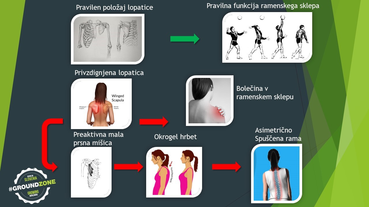 2. Največkrat je težava v nezadostni mobilnosti lopatice in/ali prsnega koša, in nepravilni funkciji mišic, ki so nanju pritrjene.