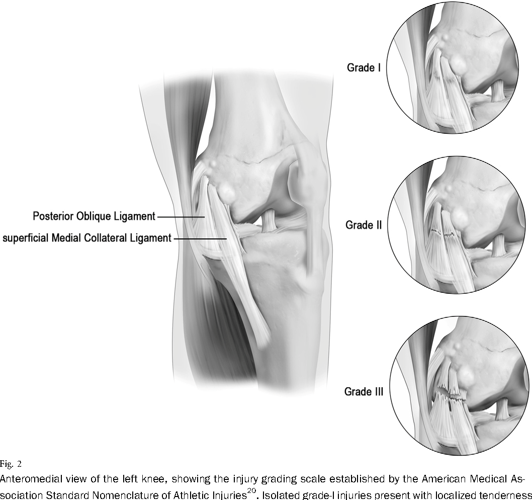 Poškodbe mišic in tetiv lahko razvrstimo na 3 stopnje. Spodnja slika prikazuje klasifikacijo in izgled poškodbe MCL strukture.